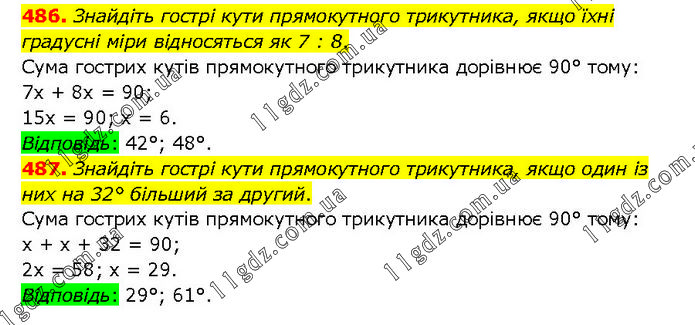 486. Знайдіть гострі кути прямокутного трикутника, якщо їхні градусні міри відносяться як 7 : 8. Сума гострих кутів прямокутного трикутника дорівнює 90° тому: 7х + 8х = 90; 15х = 90; х = 6. Відповідь: 42°; 48°. 487. Знайдіть гострі кути прямокутного трикутника, якщо один із них на 32° більший за другий. Сума гострих кутів прямокутного трикутника дорівнює 90° тому: х + х + 32 = 90; 2х = 58; х = 29. Відповідь: 29°; 61°.