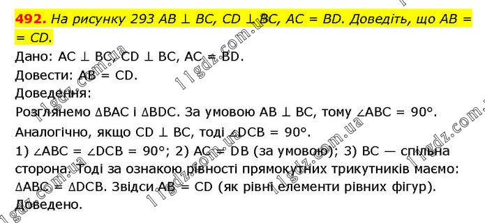 На рисунку 293 AB ⊥ BC, CD ⊥ BC, AC = BD. Доведіть, що AB = CD. Дано: AC ⊥ BC, CD ⊥ BC, AC = BD. Довести: AB = CD. Доведення: Розглянемо ∆BAC і ∆BDC. За умовою AB ⊥ BC, тому ∠ABC = 90°. Аналогічно, якщо CD ⊥ BC, тоді ∠DCB = 90°. 1) ∠ABC = ∠DCB = 90°; 2) AC = DB (за умовою); 3) BC — спільна сторона. Тоді за ознакою рівності прямокутних трикутників маємо: ∆АВС = ∆DCB. Звідси AB = CD (як рівні елементи рівних фігур). Доведено.