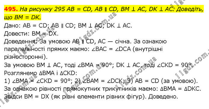 На рисунку 295 AB = CD, AB ∥ CD, BM ⊥ AC, DK ⊥ AC. Доведіть, що BM = DK. Дано: AB = CD; AB ∥ CD; BM ⊥ AC; DK ⊥ AC. Довести: BM = DX. Доведення: За умовою AB ∥ CD, AC — січна. За ознакою паралельності прямих маємо: ∠BAC = ∠DCA (внутрішні різносторонні). За умовою BM ⊥ AC, тоді ∠BMA = 90°; DK ⊥ AC, тоді ∠CKD = 90°. Розглянемо ∆BMA і ∆CKD: 1) ∠BMA = ∠CKD = 90°; 2) ∠BAM = ∠DCK; 3) AB = CD (за умовою). За ознакою рівності прямокутних трикутників маємо: ∆BMA = ∆DKC. Звідси BM = DX (як рівні елементи рівних фігур). Доведено.