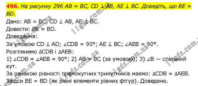 На рисунку 296 AB = BC, CD ⊥ AB, AE ⊥ BC. Доведіть, що BE = BD. Дано: AB = BC, CD ⊥ AB, AE ⊥ BC. Довести: BE = BD. Доведення: За умовою CD ⊥ AD; ∠CDB = 90°; AE ⊥ BC; ∠AEB = 90°. Розглянемо ∆CDB і ∆АЕВ: 1) ∠CDB = ∠AEB = 90°; 2) AB = BC (за умовою); 3) ∠B — спільний кут. За ознакою рівності прямокутних трикутників маємо: ∆CDB = ∆AEB. Звідси BE = BD (як рівні елементи рівних фігур). Доведено.