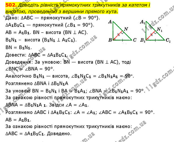 Доведіть рівність прямокутних трикутників за катетом і висотою, проведеною з вершини прямого кута. Дано: ∆ABC — прямокутний (∠B = 90°). ∆A1B1C1 — прямокутний (∠B1 = 90°). AB = A1B1. BN – висота (BN ⊥ AC). B1N1 – висота (B1N1 ⊥ A1C1). BN = B1N1. Довести: ∆ABC = ∆A1B1C1. Доведення: За умовою: BN — висота (BN ⊥ AC), тоді ∠BNC = ∠BNA = 90°. Аналогічно B1N1 — висота, ∠B1N1C1 = ∠B1N1A1 = 90°. Розглянемо ∆BNA і ∆B1N1A За умовою BN = B1N1 і BA = B1A1; ∠BNA = ∠B1N1A1 = 90°. За ознакою рівності прямокутних трикутників маємо: ∆BNA = ∆B1N1A 1. Звідси ∠A = ∠A1. Розглянемо ∆ABC і ∆A1B1C1: ∠A = ∠A1; ∠ABC = ∠A1B1C1 = 90°. AB = A1B1. За ознакою рівності прямокутних трикутників маємо: ∆ABC = ∆A1B1C1. Доведено.