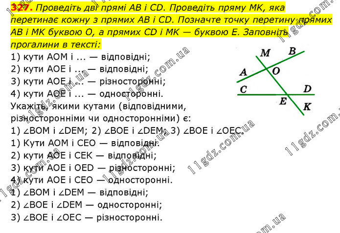 Проведіть дві прямі AB і CD. Проведіть пряму MK, яка перетинає кожну з прямих AB і CD. Позначте точку перетину прямих AB і MK буквою О, а прямих CD і MK — буквою Е. Заповніть прогалини в тексті: 1) кути AOM і ... — відповідні; 2) кути AOE і ... — відповідні; 3) кути AOE і ... — різносторонні; 4) кути AOE і ... — односторонні. Укажіть, якими кутами (відповідними, різносторонніми чи односторонніми) є: 1) ∠BOM і ∠DEM; 2) ∠BOE і ∠DEM; 3) ∠BOE і ∠OEC. 1) Кути AOM і CEO — відповідні. 2) кути AOE і CEK — відповідні; 3) кути AOE і OED — різносторонні; 4) кути AOE і CEO — односторонні. 1) ∠BOM і ∠DEM — відповідні; 2) ∠BOE і ∠DEM — односторонні; 3) ∠BOE і ∠OEC — різносторонні.
