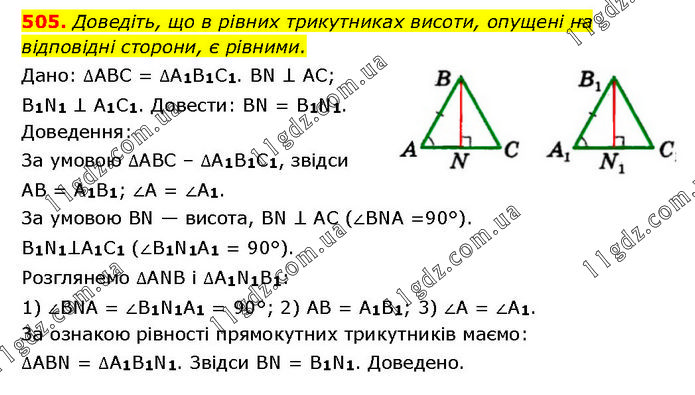Доведіть, що в рівних трикутниках висоти, опущені на відповідні сторони, є рівними. Дано: ∆ABC = ∆A1B1C1. BN ⊥ AC; B1N1 ⊥ A1C1. Довести: BN = B1N1. Доведення: За умовою ∆ABC – ∆A1B1C1, звідси AB = A1B1; ∠A = ∠A1. За умовою BN — висота, BN ⊥ AC (∠BNA =90°). B1N1⊥A1C1 (∠B1N1A1 = 90°). Розглянемо ∆ANB і ∆A1N1B1: 1) ∠BNA = ∠B1N1A1 = 90°; 2) AB = A1B1; 3) ∠A = ∠A1. За ознакою рівності прямокутних трикутників маємо: ∆ABN = ∆A1B1N1. Звідси BN = B1N1. Доведено.