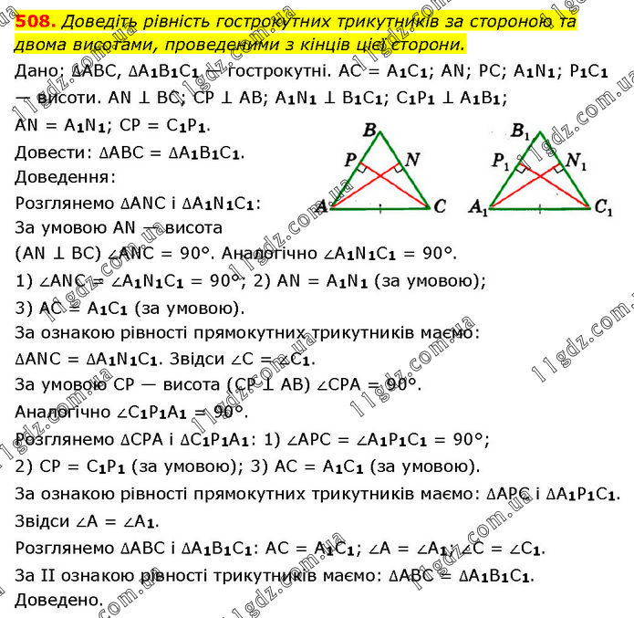 Доведіть рівність гострокутних трикутників за стороною та двома висотами, проведеними з кінців цієї сторони. Дано: ∆ABC, ∆A1B1C1 — гострокутні. AC = A1C1; AN; PC; A1N1; P1C1 — висоти. AN ⊥ BC; CP ⊥ AB; A1N1 ⊥ B1C1; C1P1 ⊥ A1B1; AN = A1N1; CP = C1P1. Довести: ∆ABC = ∆A1B1C1. Доведення: Розглянемо ∆ANC і ∆A1N1C1: За умовою AN — висота (AN ⊥ BC) ∠ANC = 90°. Аналогічно ∠A1N1C1 = 90°. 1) ∠ANC = ∠A1N1C1 = 90°; 2) AN = A1N1 (за умовою); 3) AC = A1C1 (за умовою). За ознакою рівності прямокутних трикутників маємо: ∆ANC = ∆A1N1C1. Звідси ∠C = ∠C1. За умовою CP — висота (CP ⊥ AB) ∠CPA = 90°. Аналогічно ∠C1P1A1 = 90°. Розглянемо ∆CPA і ∆C1P1A1: 1) ∠APC = ∠A1P1C1 = 90°; 2) CP = C1P1 (за умовою); 3) AC = A1C1 (за умовою). За ознакою рівності прямокутних трикутників маємо: ∆APC і ∆A1P1C1. Звідси ∠A = ∠A1. Розглянемо ∆ABC і ∆A1B1C1: AC = A1C1; ∠A = ∠A1; ∠C = ∠C1. За II ознакою рівності трикутників маємо: ∆ABC = ∆A1B1C1. Доведено.