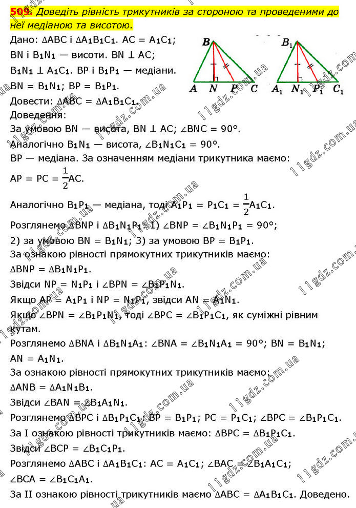 Доведіть рівність трикутників за стороною та проведеними до неї медіаною та висотою. Дано: ∆ABC і ∆A1B1C1. AC = A1C1; BN і B1N1 — висоти. BN ⊥ AC; B1N1 ⊥ A1C1. BP і B1P1 — медіани. BN = B1N1; BP = B1P1. Довести: ∆ABC = ∆A1B1C1. Доведення: За умовою BN — висота, BN ⊥ AC; ∠BNC = 90°. Аналогічно B1N1 — висота, ∠B1N1C1 = 90°. BP — медіана. За означенням медіани трикутника маємо: AP = PC = 1/2AC. Аналогічно B1P1 — медіана, тоді A1P1 = P1C1 = 1/2A1C1. Розглянемо ∆BNP і ∆B1N1P1: 1) ∠BNP = ∠B1N1P1 = 90°; 2) за умовою BN = B1N1; 3) за умовою BP = B1P1. За ознакою рівності прямокутних трикутників маємо: ∆BNP = ∆B1N1P1. Звідси NP = N1P1 і ∠BPN = ∠B1P1N1. Якщо AP = A1P1 і NP = N1P1, звідси AN = A1N1. Якщо ∠BPN = ∠B1P1N1, тоді ∠BPC = ∠B1P1C1, як суміжні рівним кутам. Розглянемо ∆BNA і ∆B1N1A1: ∠BNA = ∠B1N1A1 = 90°; ВN = B1N1; AN = A1N1. За ознакою рівності прямокутних трикутників маємо: ∆ANB = ∆A1N1B1. Звідси ∠BAN = ∠B1A1N1. Розглянемо ∆BPC і ∆B1P1C1: BP = B1P1; PC = P1C1; ∠BPC = ∠B1P1C1. За І ознакою рівності трикутників маємо: ∆BPC = ∆B1P1C1. Звідси ∠BCP = ∠B1C1P1. Розглянемо ∆ABC і ∆A1B1C1: AC = A1C1; ∠BAC = ∠B1A1C1; ∠BCA = ∠B1C1A1. За II ознакою рівності трикутників маємо ∆ABC = ∆A1B1C1. Доведено.