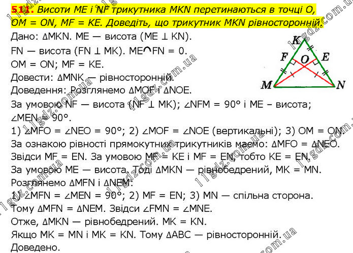 Висоти ME і NF трикутника MKN перетинаються в точці О, OM = ON, MF = KE. Доведіть, що трикутник MKN рівносторонній. Дано: ∆MKN. ME — висота (ME ⊥ KN). FN — висота (FN ⊥ MK). ME FN = 0. OM = ON; MF = KE. Довести: ∆MNK — рівносторонній. Доведення: Розглянемо ∆MOF і ∆NOE. За умовою NF — висота (NF ⊥ MK); ∠NFM = 90° і МЕ – висота; ∠MEN = 90°. 1) ∠MFO = ∠NEO = 90°; 2) ∠MOF = ∠NOE (вертикальні); 3) OM = ON. За ознакою рівності прямокутних трикутників маємо: ∆MFO = ∆NEO. Звідси MF = EN. За умовою MF = KE і MF = EN, тобто KE = EN. За умовою ME — висота. Тоді ∆MKN — рівнобедрений, MK = MN. Розглянемо ∆MFN і ∆NEM: 1) ∠MFN = ∠MEN = 90°; 2) MF = EN; 3) MN — спільна сторона. Тому ∆MFN = ∆NEM. Звідси ∠FMN = ∠MNE. Отже, ∆MKN — рівнобедрений. MK = KN. Якщо MK = MN і МK = KN. Тому ∆АВС — рівносторонній. Доведено.