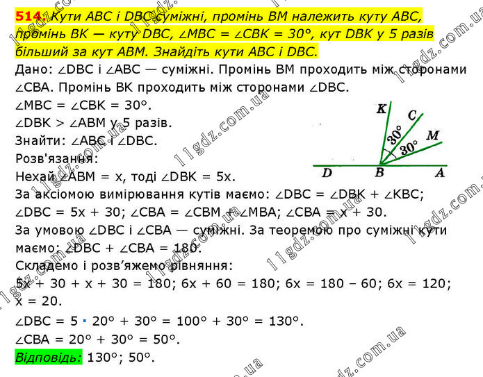 Кути ABC і DBC суміжні, промінь BM належить куту ABC, промінь BK — куту DBC, ∠MBC = ∠CBK = 30°, кут DBK у 5 разів більший за кут ABM. Знайдіть кути ABC і DBC. Дано: ∠DBC і ∠ABC — суміжні. Промінь BM проходить між сторонами ∠CBА. Промінь BK проходить між сторонами ∠DBC. ∠MBC = ∠CBK = 30°. ∠DBK > ∠ABM у 5 разів. Знайти: ∠ABC і ∠DBC. Розв'язання: Нехай ∠ABM = x, тоді ∠DBK = 5x. За аксіомою вимірювання кутів маємо: ∠DBC = ∠DBK + ∠KBC; ∠DBC = 5x + 30; ∠CBA = ∠CBM + ∠MBA; ∠CBA = x + 30. За умовою ∠DBC і ∠CBA — суміжні. За теоремою про суміжні кути маємо: ∠DBC + ∠CBA = 180. Складемо і розв’яжемо рівняння: 5х + 30 + х + 30 = 180; 6x + 60 = 180; 6х = 180 – 60; 6х = 120; х = 20. ∠DBC = 5 ∙ 20° + 30° = 100° + 30° = 130°. ∠CBA = 20° + 30° = 50°. Відповідь: 130°; 50°.