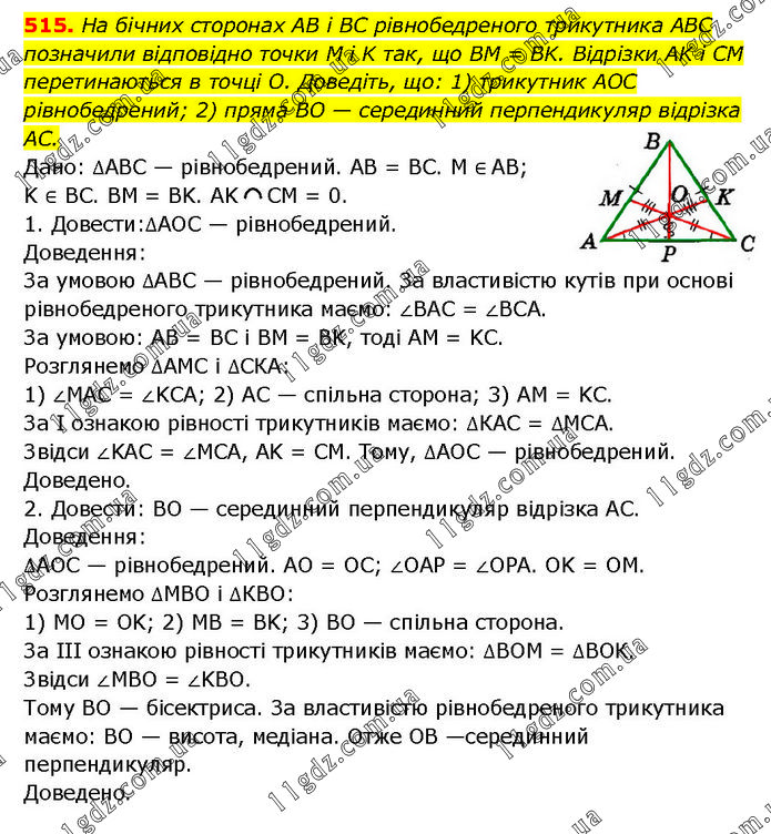 На бічних сторонах AB і BC рівнобедреного трикутника ABC позначили відповідно точки M i K так, що BM = BK. Відрізки AK і CM перетинаються в точці О. Доведіть, що: 1) трикутник AOC рівнобедрений; 2) пряма BO — серединний перпендикуляр відрізка AC. Дано: ∆ABC — рівнобедрений. AB = BC. M ∈ AB; K ∈ BC. BM = BK. AK CM = 0. 1. Довести: ∆АОС — рівнобедрений. Доведення: За умовою ∆ABC — рівнобедрений. За властивістю кутів при основі рівнобедреного трикутника маємо: ∠BAC = ∠BCA. За умовою: AB = BC і BM = BK, тоді AM = KC. Розглянемо ∆AMC і ∆СКА: 1) ∠MAC = ∠KCA; 2) AC — спільна сторона; 3) AM = KC. За І ознакою рівності трикутників маємо: ∆КАС = ∆MCА. Звідси ∠KAC = ∠MCA, AK = CM. Тому, ∆AOC — рівнобедрений. Доведено. 2. Довести: BO — серединний перпендикуляр відрізка AC. Доведення: ∆AOC — рівнобедрений. AO = ОС; ∠OAP = ∠OPA. OK = ОМ. Розглянемо ∆MBO і ∆КВО: 1) MO = OK; 2) MB = BK; 3) BO — спільна сторона. За III ознакою рівності трикутників маємо: ∆BOM = ∆ВОК. Звідси ∠MBO = ∠KBO. Тому BO — бісектриса. За властивістю рівнобедреного трикутника маємо: BO — висота, медіана. Отже OB —серединний перпендикуляр. Доведено.