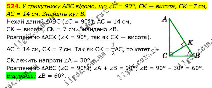 У трикутнику ABC відомо, що ∠C = 90°, CK — висота, CK = 7 см, AC = 14 см. Знайдіть кут В. Нехай даний ∆АВС (∠C = 90°), AC = 14 см, CK — висота, CK = 7 см. Знайдемо ∠B. Розглянемо ∆ACK (∠K = 90°, так як CK — висота). AC = 14 см, CK = 7 см. Так як CK = 1/2АС, то катет CK лежить напроти ∠A = 30°. Розглянемо ∆АВС (∠C = 90°); ∠A + ∠B = 90°; ∠B = 90° – 30° = 60°. Відповідь: ∠B = 60°.