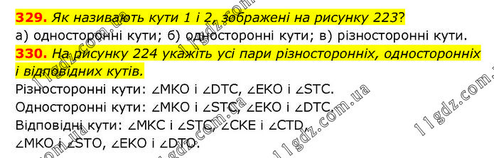329. Як називають кути 1 і 2, зображені на рисунку 223? а) односторонні кути; б) односторонні кути; в) різносторонні кути. 330. На рисунку 224 укажіть усі пари різносторонніх, односторонніх і відповідних кутів. Різносторонні кути: ∠MKO і ∠DTC, ∠EKO і ∠STC. Односторонні кути: ∠MKO і ∠STC, ∠EKO і ∠DTC. Відповідні кути: ∠MKC і ∠STC, ∠CKE і ∠CTD, ∠MKO і ∠STO, ∠EKO і ∠DTO.