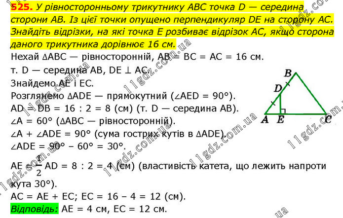 У рівносторонньому трикутнику ABC точка D — середина сторони AB. Із цієї точки опущено перпендикуляр DE на сторону AC. Знайдіть відрізки, на які точка E розбиває відрізок AC, якщо сторона даного трикутника дорівнює 16 см. Нехай ∆ABC — рівносторонній, AB = BC = AC = 16 см. т. D — середина AB, DE ⊥ AC. Знайдемо AE і EC. Розглянемо ∆ADE — прямокутний (∠AED = 90°). AD = DB = 16 : 2 = 8 (см) (т. D — середина AB). ∠A = 60° (∆ABC — рівносторонній). ∠A + ∠ADE = 90° (сума гострих кутів в ∆ADE). ∠ADE = 90° – 60° = 30°. AE = 1/2 AD = 8 : 2 = 4 (см) (властивість катета, що лежить напроти кута 30°). AC = AE + EC; EC = 16 – 4 = 12 (см). Відповідь: AE = 4 см, EC = 12 см.