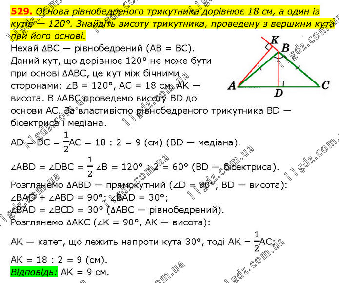 Основа рівнобедреного трикутника дорівнює 18 см, а один із кутів — 120°. Знайдіть висоту трикутника, проведену з вершини кута при його основі. Нехай ∆BC — рівнобедрений (AB = BC). Даний кут, що дорівнює 120° не може бути при основі ∆ABC, це кут між бічними сторонами: ∠B = 120°, AC = 18 см, AK — висота. B ∆ABC проведемо висоту BD до основи AC. За властивістю рівнобедреного трикутника BD — бісектриса і медіана. AD = DC = 1/2AC = 18 : 2 = 9 (см) (BD — медіана). ∠ABD = ∠DBC = 1/2 ∠B = 120° : 2 = 60° (BD — бісектриса). Розглянемо ∆ABD — прямокутний (∠D = 90°, BD — висота): ∠BAD + ∠ABD = 90°; ∠BAD = 30°; ∠BAD = ∠BCD = 30° (∆АВС — рівнобедрений). Розглянемо ∆AKС (∠K = 90°, AK — висота): AK — катет, що лежить напроти кута 30°, тоді AK = 1/2АС; AK = 18 : 2 = 9 (см). Відповідь: AK = 9 см.