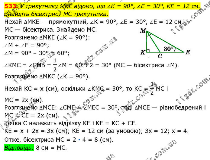 У трикутнику MKE відомо, що ∠K = 90°, ∠E = 30°, KE = 12 см. Знайдіть бісектрису MC трикутника. Нехай ∆MKE — прямокутний, ∠K = 90°, ∠E = 30°, ∠E = 12 см, MC — бісектриса. Знайдемо MC. Розглянемо ∆MKE (∠K = 90°): ∠M + ∠E = 90°; ∠M = 90° – 30° = 60°; ∠KMC = ∠CMB = 1/2∠M = 60°: 2 = 30° (MC — бісектриса ∠M). Розглянемо ∆MKC (∠K = 90°). Нехай KC = х (см), оскільки ∠KMC = 30°, то KC = 1/2 MC і MC = 2х (см). Розглянемо ∆MCE: ∠CME = ∠MEC = 30°, тоді ∆MCE — рівнобедрений і MC = CE = 2х (см). Точка C належить відрізку KЕ і KE = KС + CE. KE = х + 2х = Зх (см); KE = 12 см (за умовою); Зх = 12; х = 4. Отже, бісектриса MC = 2 ∙ 4 = 8 (см). Відповідь: 8 см = MC.