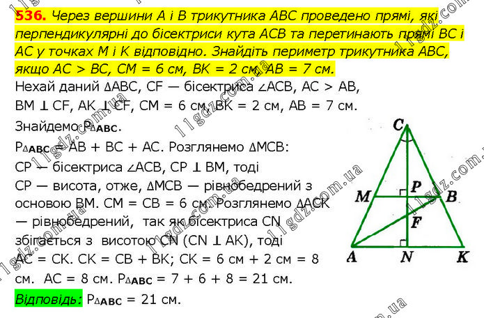 Через вершини А і В трикутника ABC проведено прямі, які перпендикулярні до бісектриси кута ACB та перетинають прямі BC і AC у точках M i K відповідно. Знайдіть периметр трикутника ABC, якщо AC > BC, CM = 6 см, BK = 2 см, AB = 7 см. Нехай даний ∆ABC, CF — бісектриса ∠ACB, AC > AB, BM ⊥ CF, AK ⊥ CF, CM = 6 см, BK = 2 см, AB = 7 см. Знайдемо P∆ABC. P∆ABC = AB + BC + AC. Розглянемо ∆MCB: CP — бісектриса ∠ACB, CP ⊥ BM, тоді CP — висота, отже, ∆MCB — рівнобедрений з основою BM. CM = CB = 6 см. Розглянемо ∆ACK — рівнобедрений, так як бісектриса CN збігається з висотою CN (CN ⊥ AK), тоді AC = CK. CK = CB + BK; CK = 6 см + 2 см = 8 см. AC = 8 см. P∆ABC = 7 + 6 + 8 = 21 см. Відповідь: P∆АВС = 21 см.