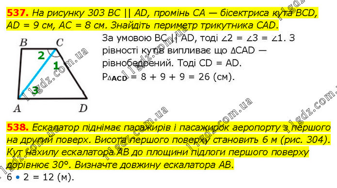 537. На рисунку 303 BC || AD, промінь CA — бісектриса кута BCD, AD = 9 см, AC = 8 см. Знайдіть периметр трикутника CAD. За умовою BC || AD, тоді ∠2 = ∠3 = ∠1. З рівності кутів випливає що ∆CAD — рівнобедрений. Тоді CD = AD. Р∆АCD = 8 + 9 + 9 = 26 (см). 538. Ескалатор піднімає пасажирів і пасажирок аеропорту з першого на другий поверх. Висота першого поверху становить 6 м (рис. 304). Кут нахилу ескалатора AB до площини підлоги першого поверху дорівнює 30°. Визначте довжину ескалатора AB. 6 • 2 = 12 (м).