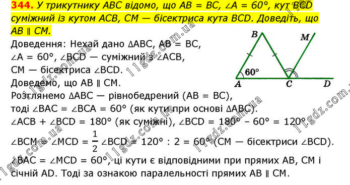 У трикутнику ABC відомо, що AB = BC, ∠A = 60°, кут BCD суміжний із кутом АСВ, CM — бісектриса кута BCD. Доведіть, що AB ∥ CM. Доведення: Нехай дано ∆ABC, AB = BC, ∠A = 60°, ∠BCD — суміжний з ∠ACB, CM — бісектриса ∠BCD. Доведемо, що AB ∥ CM. Розглянемо ∆ABC — рівнобедрений (AB = BC), тоді ∠BAC = ∠BCA = 60° (як кути при основі ∆АВС). ∠ACB + ∠BCD = 180° (як суміжні), ∠BCD = 180° – 60° = 120°. ∠BCM = ∠MCD = 1/2 ∠BCD = 120° : 2 = 60° (CM — бісектриси ∠BCD). ∠BAC = ∠MCD = 60°, ці кути є відповідними при прямих AB, CM і січній AD. Тоді за ознакою паралельності прямих AB ∥ CM.
