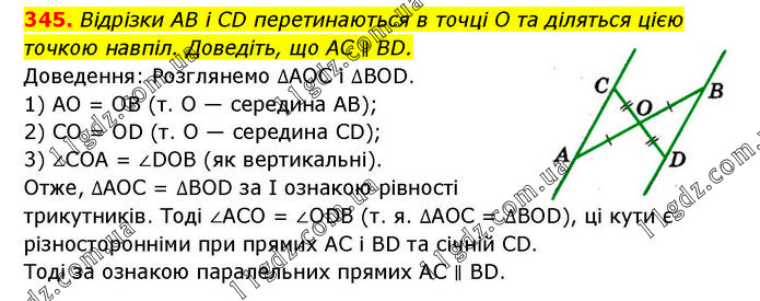 Відрізки AB і CD перетинаються в точці O та діляться цією точкою навпіл. Доведіть, що AC ∥ BD. Доведення: Розглянемо ∆AOC і ∆BOD. 1) AO = OB (т. O — середина AB); 2) CO = OD (т. O — середина CD); 3) ∠COA = ∠DOB (як вертикальні). Отже, ∆AOC = ∆BOD за І ознакою рівності трикутників. Тоді ∠ACO = ∠ODB (т. я. ∆AOC = ∆BOD), ці кути є різносторонніми при прямих AC і BD та січній CD. Тоді за ознакою паралельних прямих AC ∥ BD.