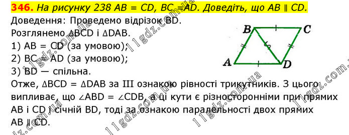На рисунку 238 AB = CD, BC =AD. Доведіть, що AB ∥ CD. Доведення: Проведемо відрізок BD. Розглянемо ∆BCD і ∆DAB. 1) AB = CD (за умовою); 2) BC = AD (за умовою); 3) BD — спільна. Отже, ∆BCD = ∆DAB за III ознакою рівності трикутників. З цього випливає, що ∠ABD = ∠CDB, а ці кути є різносторонніми при прямих AB і CD і січній BD, тоді за ознакою паралельності двох прямих AB ∥ CD.