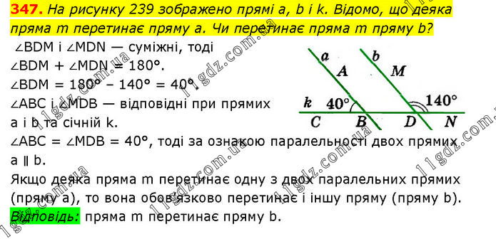 На рисунку 239 зображено прямі а, b і k. Відомо, що деяка пряма m перетинає пряму а. Чи перетинає пряма m пряму b? ∠BDM і ∠MDN — суміжні, тоді ∠BDM + ∠MDN = 180°. ∠BDM = 180° – 140° = 40°. ∠ABC і ∠MDB — відповідні при прямих а і b та січній k. ∠ABC = ∠MDB = 40°, тоді за ознакою паралельності двох прямих а ∥ b. Якщо деяка пряма m перетинає одну з двох паралельних прямих (пряму а), то вона обов’язково перетинає і іншу пряму (пряму b). Відповідь: пряма m перетинає пряму b.