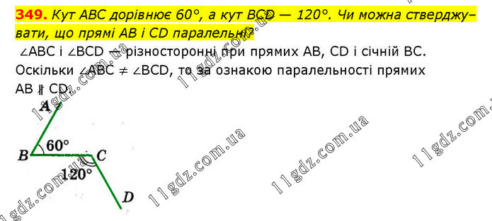 Кут ABC дорівнює 60°, а кут BCD — 120°. Чи можна стверджувати, що прямі AB і CD паралельні? ∠ABC і ∠BCD — різносторонні при прямих AB, CD і січній BC. Оскільки ∠ABC ≠ ∠BCD, то за ознакою паралельності прямих AB ∦ CD.