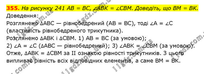 На рисунку 241 AB = BC, ∠ABK = ∠CBM. Доведіть, що BM = BK. Доведення: Розглянемо ∆ABC — рівнобедрений (AB = BC), тоді ∠A = ∠C (властивість рівнобедреного трикутника). Розглянемо ∆ABK і ∆CBM. 1) AB = BC (за умовою); 2) ∠A = ∠C (∆ABC — рівнобедрений); 3) ∠ABK = ∠CBM (за умовою). Отже, ∆АВK = ∆CBM за II ознакою рівності трикутників. З цього випливає рівність всіх відповідних елементів, а саме BM = BK.