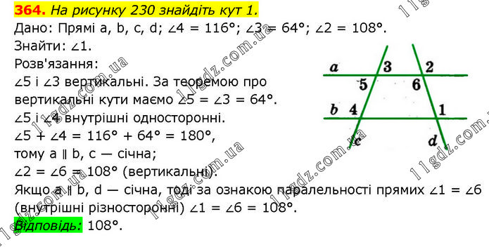 На рисунку 230 знайдіть кут 1. Дано: Прямі a, b, c, d; ∠4 = 116°; ∠3 = 64°; ∠2 = 108°. Знайти: ∠1. Розв'язання: ∠5 і ∠3 вертикальні. За теоремою про вертикальні кути маємо ∠5 = ∠3 = 64°. ∠5 і ∠4 внутрішні односторонні. ∠5 + ∠4 = 116° + 64° = 180°, тому а ∥ b, с — січна; ∠2 = ∠6 = 108° (вертикальні). Якщо а ∥ b, d — січна, тоді за ознакою паралельності прямих ∠1 = ∠6 (внутрішні різносторонні) ∠1 = ∠6 = 108°. Відповідь: 108°.