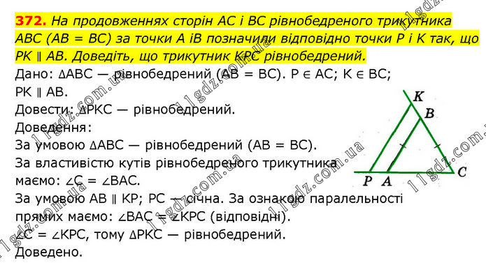 На продовженнях сторін AC і BC рівнобедреного трикутника ABC (AB = BC) за точки A iB позначили відповідно точки P i K так, що PK ∥ AB. Доведіть, що трикутник KPC рівнобедрений. Дано: ∆ABC — рівнобедрений (AB = BС). P ∈ AC; K ∈ BC; PK ∥ AB. Довести: ∆PKC — рівнобедрений. Доведення: За умовою ∆ABC — рівнобедрений (AB = BC). За властивістю кутів рівнобедреного трикутника маємо: ∠C = ∠BAC. За умовою AB ∥ KP; PC — січна. За ознакою паралельності прямих маємо: ∠BAC = ∠KPC (відповідні). ∠C = ∠KPC, тому ∆PKC — рівнобедрений. Доведено.