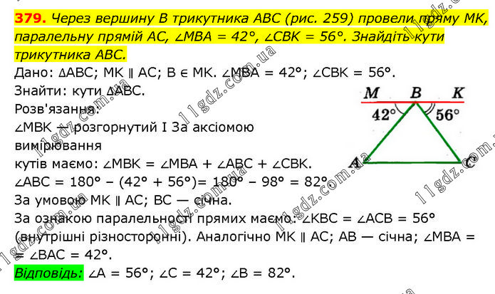 Через вершину В трикутника ABC (рис. 259) провели пряму MK, паралельну прямій AC, ∠MBA = 42°, ∠CBK = 56°. Знайдіть кути трикутника ABC. Дано: ∆АВС; MK ∥ AC; В ∈ MK. ∠MBA = 42°; ∠CBK = 56°. Знайти: кути ∆ABC. Розв'язання: ∠MBK — розгорнутий І За аксіомою вимірювання кутів маємо: ∠MBK = ∠MBA + ∠ABC + ∠CBK. ∠ABC = 180° – (42° + 56°)= 180° – 98° = 82°. За умовою MK ∥ AC; BC — січна. За ознакою паралельності прямих маємо: ∠KBC = ∠ACB = 56° (внутрішні різносторонні). Аналогічно MK ∥ AC; AB — січна; ∠MBA = = ∠BAC = 42°. Відповідь: ∠A = 56°; ∠C = 42°; ∠B = 82°.