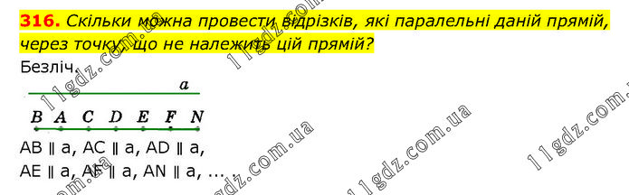 Скільки можна провести відрізків, які паралельні даній прямій, через точку, що не належить цій прямій? Безліч. AB ∥ а, AC ∥ а, AD ∥ а, AE ∥ a, AF ∥ a, AN ∥ а, ... .