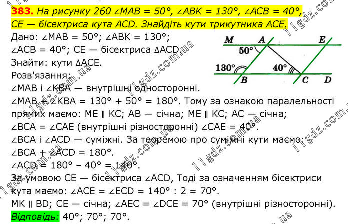 На рисунку 260 ∠MAB = 50°, ∠ABK = 130°, ∠ACB = 40°, CE — бісектриса кута ACD. Знайдіть кути трикутника АСЕ. Дано: ∠MAB = 50°; ∠ABK = 130°; ∠ACB = 40°; CE — бісектриса ∆ACD. Знайти: кути ∆АСЕ. Розв'язання: ∠MAB і ∠KBA — внутрішні односторонні. ∠MAB + ∠KBA = 130° + 50° = 180°. Тому за ознакою паралельності прямих маємо: ME ∥ KC; AB — січна; ME ∥ KC; AC — січна; ∠BCA = ∠CAE (внутрішні різносторонні) ∠CAE = 40°. ∠BCA і ∠ACD — суміжні. За теоремою про суміжні кути маємо: ∠BCA + ∠ACD = 180°. ∠ACD = 180° – 40° = 140°. За умовою CE — бісектриса ∠ACD, Тоді за означенням бісектриси кута маємо: ∠ACE = ∠ECD = 140° : 2 = 70°. MK ∥ BD; CE — січна; ∠AEC = ∠DCE = 70° (внутрішні різносторонні). Відповідь: 40°; 70°; 70°.