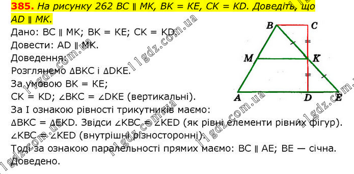 На рисунку 262 BC ∥ MK, BK = КЕ, CK = KD. Доведіть, що AD ∥ MK. Дано: BC ∥ MK; BK = КЕ; CK = KD. Довести: AD ∥ МK. Доведення: Розглянемо ∆BKC і ∆DKE. За умовою BK = КЕ; CK = KD; ∠BKC = ∠DKE (вертикальні). За І ознакою рівності трикутників маємо: ∆BKC = ∆EKD. Звідси ∠KBC = ∠KED (як рівні елементи рівних фігур). ∠KBC = ∠KED (внутрішні різносторонні). Тоді за ознакою паралельності прямих маємо: BC ∥ AE; BE — січна. Доведено.