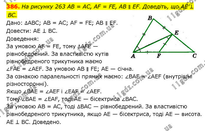 На рисунку 263 AB = AC, AF = FE, AB ∥ EF. Доведіть, що AE ⊥ BC. Дано: ∆АВС; AB = AC; AF = FE; AB ∥ EF. Довести: AE ⊥ BC. Доведення: За умовою AF = FE, тому ∆AFE — рівнобедрений. За властивістю кутів рівнобедреного трикутника маємо ∠FAE = ∠AEF. За умовою AB ∥ FE; AE — січна. За ознакою паралельності прямих маємо: ∠BAE = ∠AEF (внутрішні різносторонні). Якщо ∠BAE = ∠AEF і ∠EAF = ∠AEF. Тому ∠BAE = ∠EAF, тоді AE — бісектриса ∠BAC. За умовою AB = AC, тоді ∆BAC — рівнобедрений. За властивістю рівнобедреного трикутника, якщо AE — бісектриса, тоді AE — висота. AE ⊥ BC. Доведено.