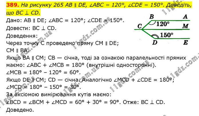 На рисунку 265 AB ∥ DE, ∠ABC = 120°, ∠CDE = 150°. Доведіть, що BC ⊥ CD. Дано: AB ∥ DE; ∠ABC = 120°; ∠CDE = 150°. Довести: BC ⊥ CD. Доведення: Через точку C проведемо пряму CM ∥ DE; CM ∥ BA. Якщо BA ∥ CM; CB — січна, тоді за ознакою паралельності прямих маємо: ∠ABC + ∠MCB = 180° (внутрішні односторонні). ∠MCB = 180° – 120° = 60°. Якщо DE ∥ CM; CD — січна. Аналогічно ∠MCD + ∠CDE = 180°; ∠MCD = 180° – 150° = 30°. За аксіомою вимірювання кутів маємо: ∠BCD = ∠BCM + ∠MCD = 60° + 30° = 90°. Отже: BC ⊥ CD. Доведено.