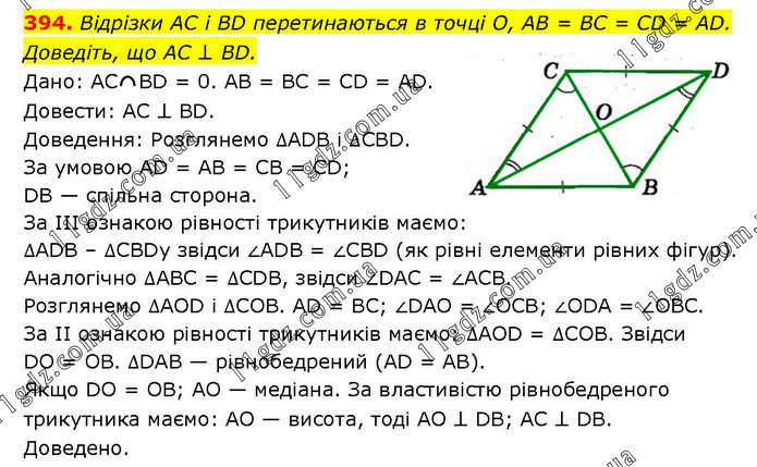 Відрізки AC і BD перетинаються в точці О, AB = BC = CD = AD. Доведіть, що AC ⊥ BD. Дано: AC BD = 0. AB = BC = CD = AD. Довести: AC ⊥ BD. Доведення: Розглянемо ∆ADB і ∆CBD. За умовою AD = AB = CB = CD; DB — спільна сторона. За III ознакою рівності трикутників маємо: ∆ADB – ∆CBDy звідси ∠ADB = ∠CBD (як рівні елементи рівних фігур). Аналогічно ∆ABC = ∆CDB, звідси ∠DAC = ∠ACB. Розглянемо ∆AOD і ∆COB. AD = BC; ∠DAO = ∠OCB; ∠ODA = ∠OBC. За II ознакою рівності трикутників маємо: ∆AOD = ∆СОВ. Звідси DO = OB. ∆DAB — рівнобедрений (AD = AB). Якщо DO = OB; AO — медіана. За властивістю рівнобедреного трикутника маємо: AO — висота, тоді AO ⊥ DB; AC ⊥ DB. Доведено.