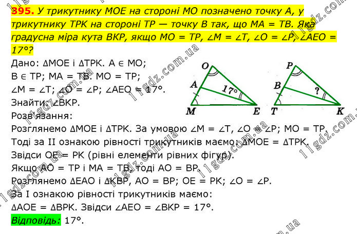 У трикутнику MOE на стороні MO позначено точку А, у трикутнику TPK на стороні TP — точку В так, що MA = TB. Яка градусна міра кута ВКР, якщо MO = TP, ∠M = ∠T, ∠O = ∠P, ∠AEO = 17°? Дано: ∆MOE і ∆ТРК. А ∈ MO; В ∈ TP; MA = TB. MO = TP; ∠M = ∠T; ∠O = ∠P; ∠AEO = 17°. Знайти: ∠BKP. Розв'язання: Розглянемо ∆MOE і ∆ТРK. За умовою ∠M = ∠T, ∠O = ∠P; MO = TP. Тоді за II ознакою рівності трикутників маємо: ∆MOE = ∆TPK. Звідси OE = РK (рівні елементи рівних фігур). Якщо AO = TP i MA = TB, тоді AO = BP. Розглянемо ∆EАО і ∆КВР, AO = BP; OE = РK; ∠O = ∠P. За І ознакою рівності трикутників маємо: ∆AOE = ∆ВРK. Звідси ∠AEO = ∠BKP = 17°. Відповідь: 17°.