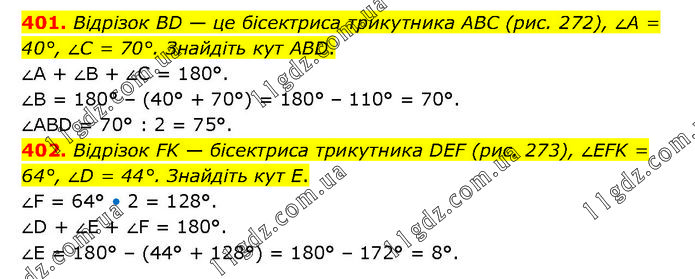 401. Відрізок BD — це бісектриса трикутника ABC (рис. 272), ∠A = 40°, ∠C = 70°. Знайдіть кут ABD. ∠A + ∠B + ∠C = 180°. ∠B = 180° – (40° + 70°) = 180° – 110° = 70°. ∠ABD = 70° : 2 = 75°. 402. Відрізок FK — бісектриса трикутника DEF (рис. 273), ∠EFK = 64°, ∠D = 44°. Знайдіть кут Е. ∠F = 64° • 2 = 128°. ∠D + ∠E + ∠F = 180°. ∠E = 180° – (44° + 128°) = 180° – 172° = 8°.