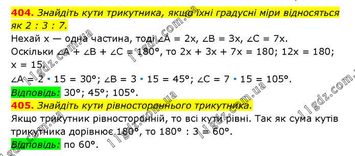 404. Знайдіть кути трикутника, якщо їхні градусні міри відносяться як 2 : 3 : 7. Нехай х — одна частина, тоді ∠A = 2х, ∠B = Зх, ∠C = 7х. Оскільки ∠A + ∠B + ∠C = 180°, то 2х + 3x + 7x = 180; 12х = 180; х = 15. ∠A = 2 ∙ 15 = 30°; ∠B = 3 ∙ 15 = 45°; ∠C = 7 ∙ 15 = 105°. Відповідь: 30°; 45°; 105°. 405. Знайдіть кути рівностороннього трикутника. Якщо трикутник рівносторонній, то всі кути рівні. Так як сума кутів трикутника дорівнює 180°, то 180° : 3 = 60°. Відповідь: по 60°.