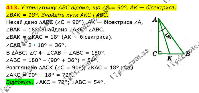 У трикутнику ABC відомо, що ∠C = 90°, AK — бісектриса, ∠BAK = 18°. Знайдіть кути AKC і ABC. Нехай дано ∆ABC (∠C = 90°), AK — бісектриса ∠A, ∠BAK = 18°. Знайдемо ∠AKC і ∠ABC. ∠BAK = ∠KAC = 18° (AK — бісектриса). ∠CAB = 2 ∙ 18° = 36°. В ∆ABC: ∠C 4– ∠CAB + ∠ABC = 180°. ∠ABC = 180° – (90° + 36°) = 54°. Розглянемо ∆ACK (∠C = 90°), ∠KAC = 18°, тоді ∠AKC = 90° – 18° = 72°. Відповідь: ∠AKC = 72°; ∠ABC = 54°.