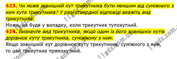 423. Чи може зовнішній кут трикутника бути меншим від суміжного з ним кута трикутника? У разі ствердної відповіді вкажіть вид трикутника. Може, це буде у випадку, коли трикутник тупокутний. 424. Визначте вид трикутника, якщо один із його зовнішніх кутів дорівнює куту трикутника, суміжному з ним. Якщо зовнішній кут дорівнює куту трикутника, суміжного з ним, то цей трикутник прямокутний.