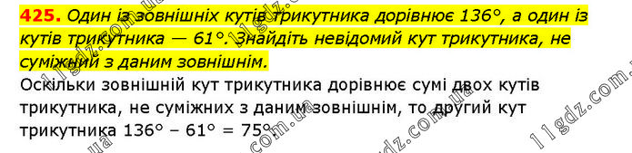Один із зовнішніх кутів трикутника дорівнює 136°, а один із кутів трикутника — 61°. Знайдіть невідомий кут трикутника, не суміжний з даним зовнішнім. Оскільки зовнішній кут трикутника дорівнює сумі двох кутів трикутника, не суміжних з даним зовнішнім, то другий кут трикутника 136° – 61° = 75°.