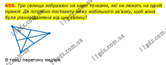 Три селища зображені на карті точками, які не лежать на одній прямій. Де потрібно поставити вежу мобільного зв’язку, щоб вона була рівновіддалена від цих селищ?