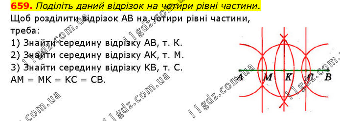 Поділіть даний відрізок на чотири рівні частини. Щоб розділити відрізок AB на чотири рівні частини, треба: 1) Знайти середину відрізку AB, т. К. 2) Знайти середину відрізку AK, т. М. 3) Знайти середину відрізку KB, т. С. AM = MK = KС = CB.