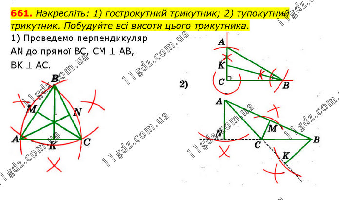 Накресліть: 1) гострокутний трикутник; 2) тупокутний трикутник. Побудуйте всі висоти цього трикутника. 1) Проведемо перпендикуляр AN до прямої BC, CM ⊥ AB, BK ⊥ AC.