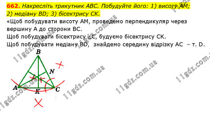 Накресліть трикутник ABC. Побудуйте його: 1) висоту AM; 2) медіану BD; 3) бісектрису CK. «Щоб побудувати висоту AM, проведемо перпендикуляр через вершину А до сторони BC. Щоб побудувати бісектрису ∠C, будуємо бісектрису CK. Щоб побудувати медіану BD, знайдемо середину відрізку AC – т. D.