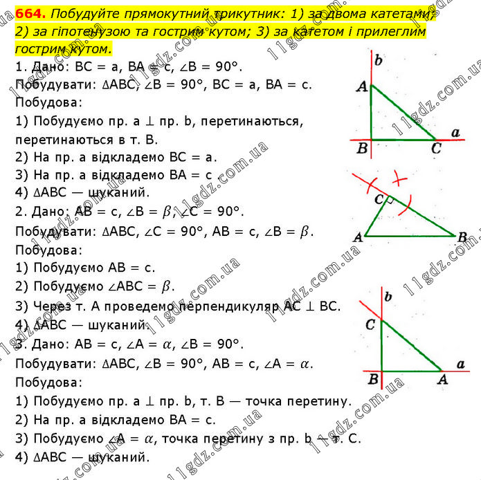 Побудуйте прямокутний трикутник: 1) за двома катетами; 2) за гіпотенузою та гострим кутом; 3) за катетом і прилеглим гострим кутом. 1. Дано: BC = а, BA = c, ∠B = 90°. Побудувати: ∆ABC, ∠B = 90°, BC = а, BA = с. Побудова: 1) Побудуємо пр. а ⊥ пр. b, перетинаються, перетинаються в т. В. 2) На пр. а відкладемо BC = а. 3) На пр. а відкладемо BA = с . 4) ∆ABC — шуканий. 2. Дано: AB = с, ∠B = β, ∠C = 90°. Побудувати: ∆ABC, ∠C = 90°, AB = с, ∠B = β. Побудова: 1) Побудуємо AB = с. 2) Побудуємо ∠ABC = β. 3) Через т. А проведемо перпендикуляр AC ⊥ BC. 4) ∆ABC — шуканий. 3. Дано: AB = с, ∠A = α, ∠B = 90°. Побудувати: ∆ABC, ∠B = 90°, AB = с, ∠A = α. Побудова: 1) Побудуємо пр. а ⊥ пр. b, т. В — точка перетину. 2) На пр. а відкладемо BA = с. 3) Побудуємо ∠A = α, точка перетину з пр. b — т. С. 4) ∆ABC — шуканий.