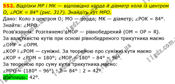 Відрізки MP і MK — відповідно хорда й діаметр кола із центром О, ∠POK = 84° (рис. 317). Знайдіть кут МРО. Дано: Коло з центром О; MO — хорда; MK — діаметр; ∠POK = 84°. Знайти: ∠MPO. Розв'язання: Розглянемо ∆MOP — рівнобедрений (ОМ = OP = R). За властивістю кутів при основі рівнобедреного трикутника маємо ∠OMP = ∠OPM. ∠KOP і ∠POM — суміжні. За теоремою про суміжні кути маємо ∠KOP + ∠POM = 180°; ∠MOP = 180° – 84° = 96°. За теоремою про суму кутів трикутника маємо: ∠MPO = (180° – 96°) : 2 = 84° : 2 = 42°. Відповідь: 42°.