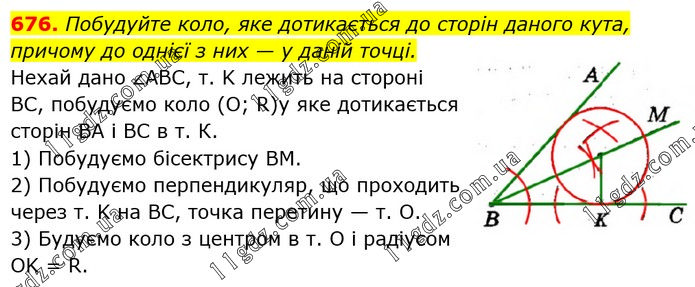 Побудуйте коло, яке дотикається до сторін даного кута, причому до однієї з них — у даній точці. Нехай дано ∠ABC, т. K лежить на стороні BC, побудуємо коло (О; R)y яке дотикається сторін BA і BC в т. К. 1) Побудуємо бісектрису BM. 2) Побудуємо перпендикуляр, що проходить через т. K на BC, точка перетину — т. О. 3) Будуємо коло з центром в т. O і радіусом OK = R.