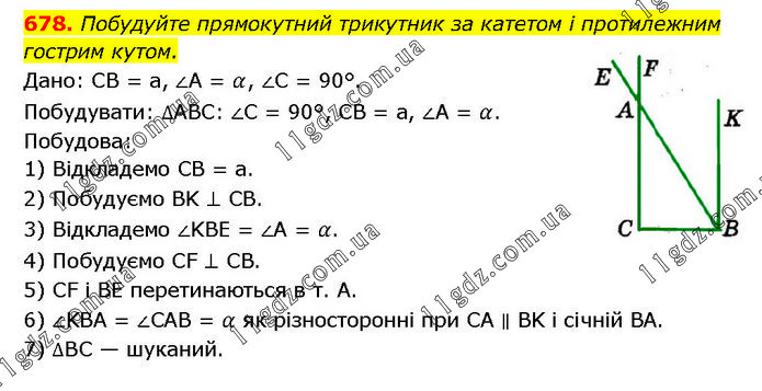 Побудуйте прямокутний трикутник за катетом і протилежним гострим кутом. Дано: CB = a, ∠A = α, ∠C = 90°. Побудувати: ∆ABC: ∠C = 90°, CB = а, ∠A = α. Побудова: 1) Відкладемо CB = а. 2) Побудуємо BK ⊥ CB. 3) Відкладемо ∠KBE = ∠A = α. 4) Побудуємо CF ⊥ CB. 5) CF і BE перетинаються в т. А. 6) ∠KBA = ∠CAB = α як різносторонні при CA ∥ BK і січній BA. 7) ∆BC — шуканий.
