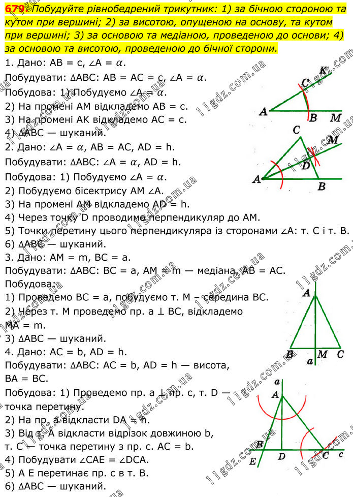 Побудуйте рівнобедрений трикутник: 1) за бічною стороною та кутом при вершині; 2) за висотою, опущеною на основу, та кутом при вершині; 3) за основою та медіаною, проведеною до основи; 4) за основою та висотою, проведеною до бічної сторони. 1. Дано: AB = с, ∠A = α. Побудувати: ∆ABC: AB = AC = с, ∠A = α. Побудова: 1) Побудуємо ∠A = α. 2) Ha промені AM відкладемо AB = с. 3) На промені AK відкладемо AC = с. 4) ∆ABC — шуканий. 2. Дано: ∠A = α, AB = AC, AD = h. Побудувати: ∆ABC: ∠A = α, AD = h. Побудова: 1) Побудуємо ∠A = α. 2) Побудуємо бісектрису AM ∠A. 3) Ha промені AM відкладемо AD = h. 4) Через точку D проводимо перпендикуляр до AM. 5) Точки перетину цього перпендикуляра із сторонами ∠A: т. C і т. В. 6) ∆ABC — шуканий. 3. Дано: AM = m, BC = а. Побудувати: ∆ABC: BC = а, AM = m — медіана, AB = AC. Побудова: 1) Проведемо BC = а, побудуємо т. M – середина BC. 2) Через т. M проведемо пр. a ⊥ BC, відкладемо MA = m. 3) ∆ABC — шуканий. 4. Дано: AC = b, AD = h. Побудувати: ∆ABC: AC = b, AD = h — висота, BA = BC. Побудова: 1) Проведемо пр. а ⊥ пр. с, т. D — точка перетину. 2) На пр. а відкласти DA = h. 3) Від т. А відкласти відрізок довжиною b, т. C — точка перетину з пр. с. AC = b. 4) Побудувати ∠CAE = ∠DCА. 5) A Е перетинає пр. с в т. В. 6) ∆ABC — шуканий.