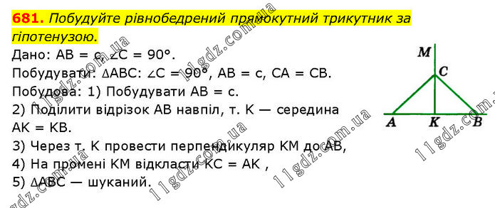 Побудуйте рівнобедрений прямокутний трикутник за гіпотенузою. Дано: AB = c, ∠C = 90°. Побудувати: ∆АВС: ∠C = 90°, AB = с, CA = CB. Побудова: 1) Побудувати AB = c. 2) Поділити відрізок AB навпіл, т. K — середина AK = KB. 3) Через т. K провести перпендикуляр KM до AB, 4) На промені KM відкласти KC = AK, 5) ∆ABC — шуканий.
